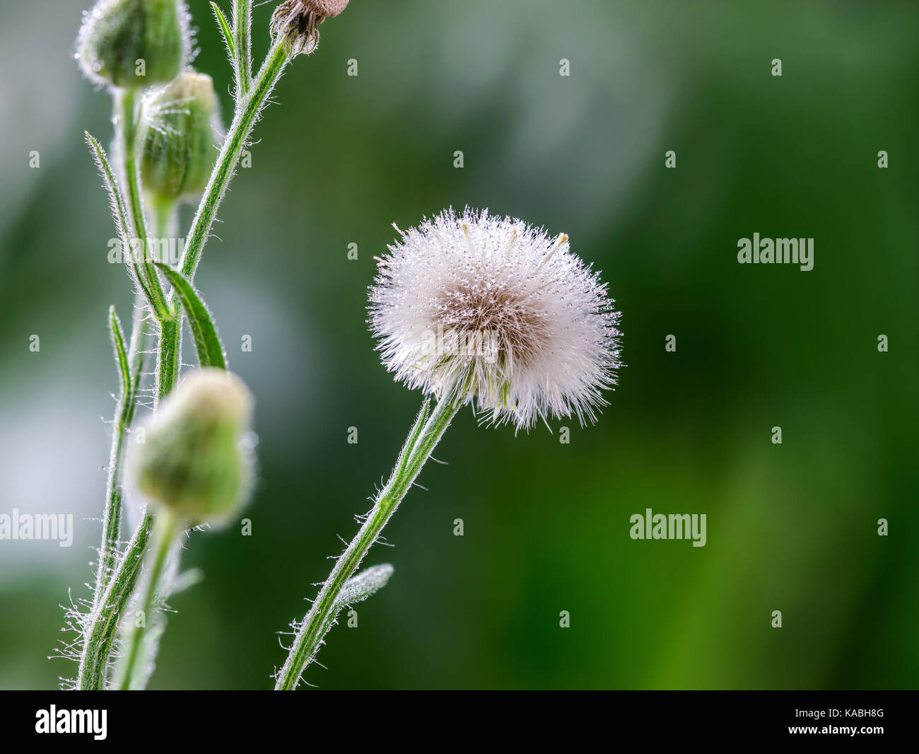 Macro Closeup Of A White Dandelion Flower Head And Seeds On A Green Background Showing Many Rain Water Droplets On The Flower Seeds And Petals Stock Photo Alamy